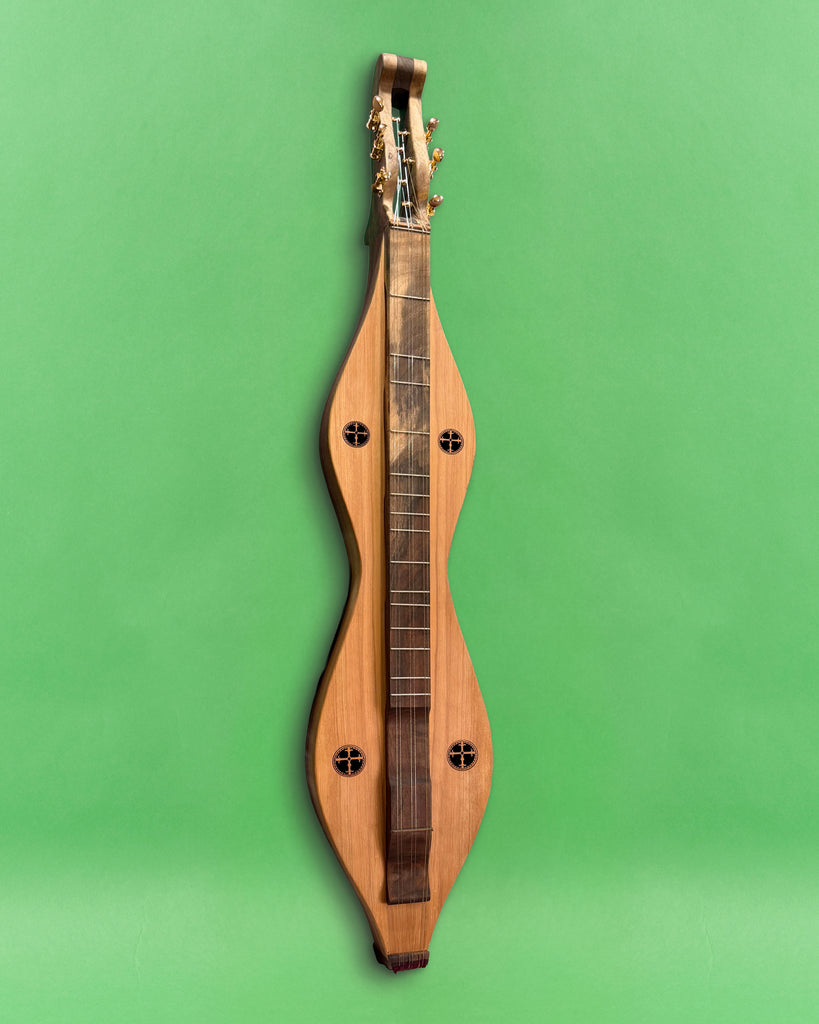 This 6-string hourglass dulcimer features Fleur de Lis style open cross sound hole rosettes, a bookmatched Western red cedar top, and black walnut back, sides, and fretboard. Our 6-string dulcimers have a big beautiful sound that resonates in the larger body. It has 6 Grover gold-plated "Sta-Tite" metal tuners with brass gears and 14:1 gear ratio for microfine tuning.
