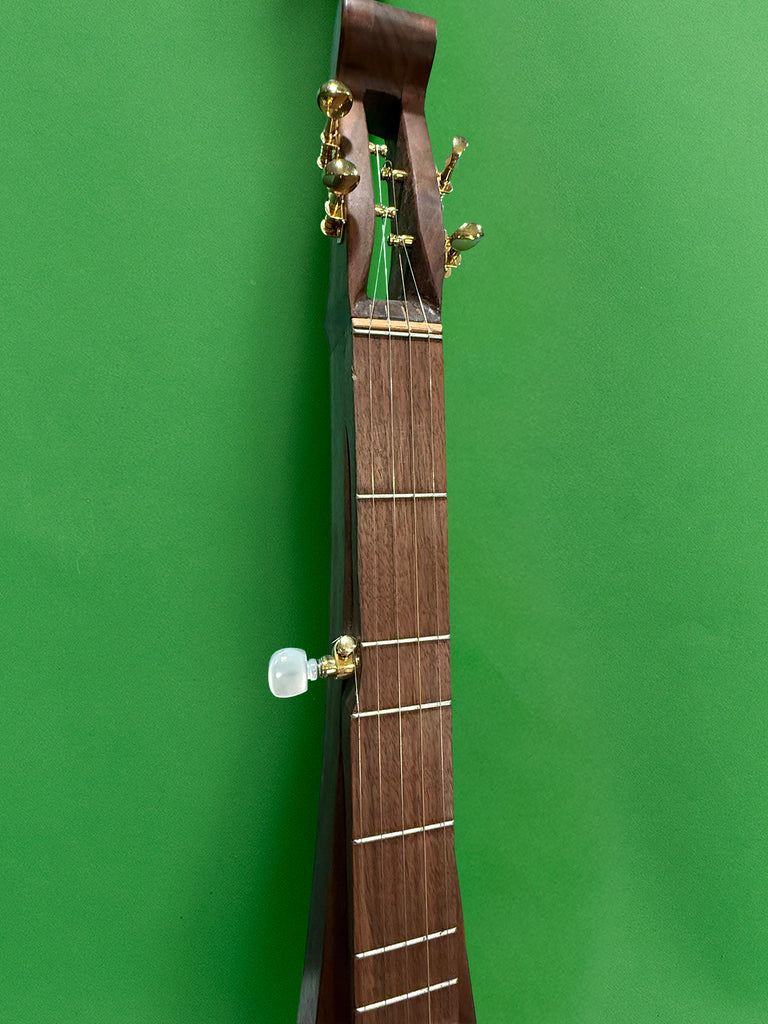 The Banjomer is made of solid walnut. We select choice boards with wood grains that we bookmatch to encircle the drum head on the top. The top, sides and back all have bookmatched wood grains. It has four Grover gold-plated "Sta-tite" tuning machines with a gear ratio of 14:1 for microfine tuning, and one Grover in-line planetary geared tuning peg.