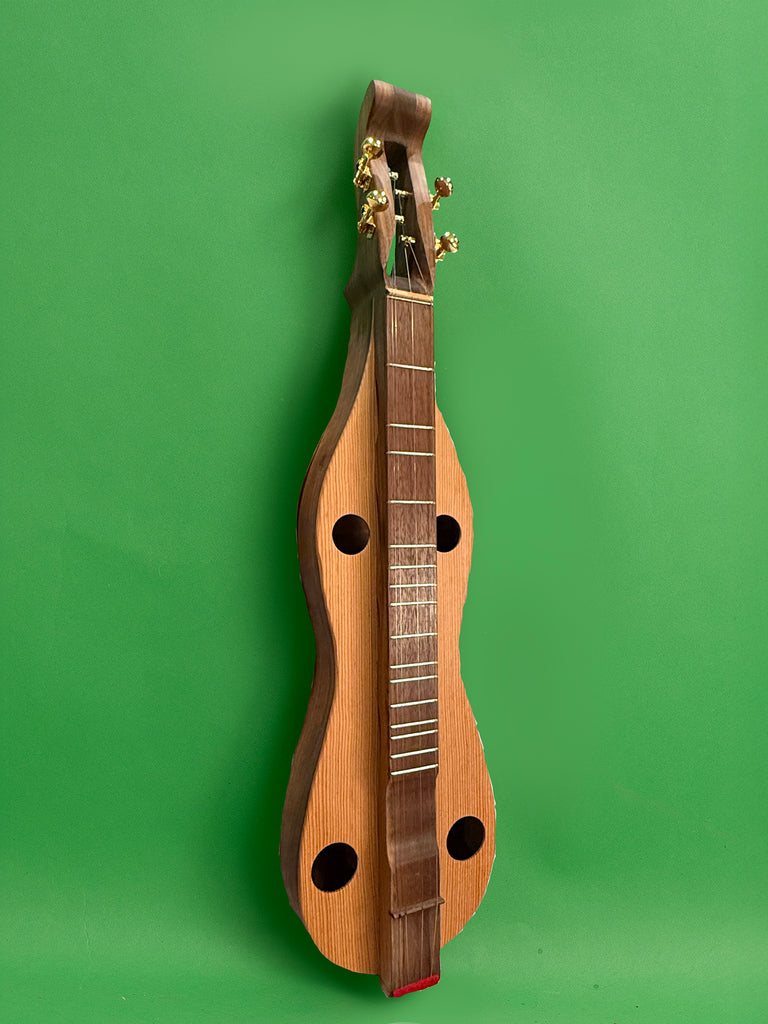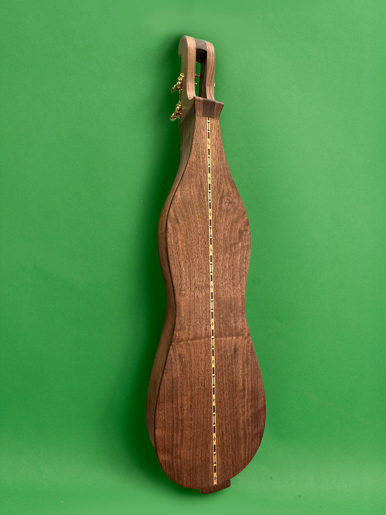 Gary Putnam is a friend and former dulcimer builder. His unique design features a curved bottom (an extension of the curved sides), a decorative inlay strip in the back, a full fretboard, and two octaves of notes. A delightful soprano instrument, this dulcimer features a black walnut body, sides, and fretboard, and a Western red cedar top with round sound holes. The large body produces a full sound for a soprano. It has four gold-plated Grover "Sta-Tite" metal tuners with brass gears and 14:1 gear ratio.