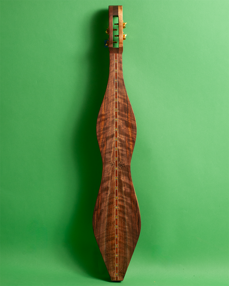 This is an hourglass shaped dulcimer contoured in the Huntington, WV tradition. Our most popular model and known for well balanced treble and bass tones, this 4-string June Apple model is crafted with a bookmatched fir top with hand carved traditional heart sound holes, bookmatched walnut steam bent and seasoned sides. A decorative wooden strip is inlayed on the center seam of a perfectly bookmatched walnut back. It has gold-plated Grover "Sta-Tite" metal tuners with brass gears and 14:1 gear ratio for microfine tuning.