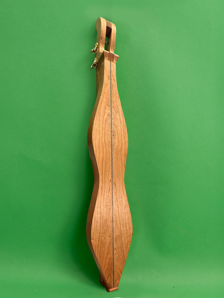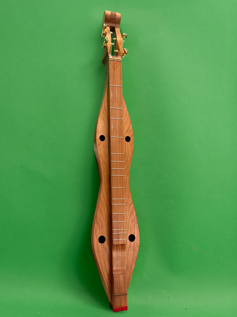 This is an hourglass shaped dulcimer contoured in the Huntington, WV tradition. Our most popular model and known for well balanced treble and bass tones, this 4-string June Apple model is crafted with a bookmatched cherry top with round sound holes, bookmatched cherry back, and bookmatched cherry steam bent and seasoned sides. A decorative wooden strip is inlayed on the center seam of the bookmatched back. It has gold-plated Grover "Sta-Tite" metal tuners with brass gears and 14:1 gear ratio for microfine tuning.