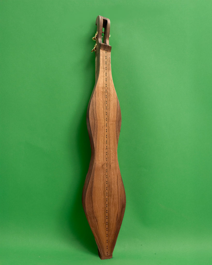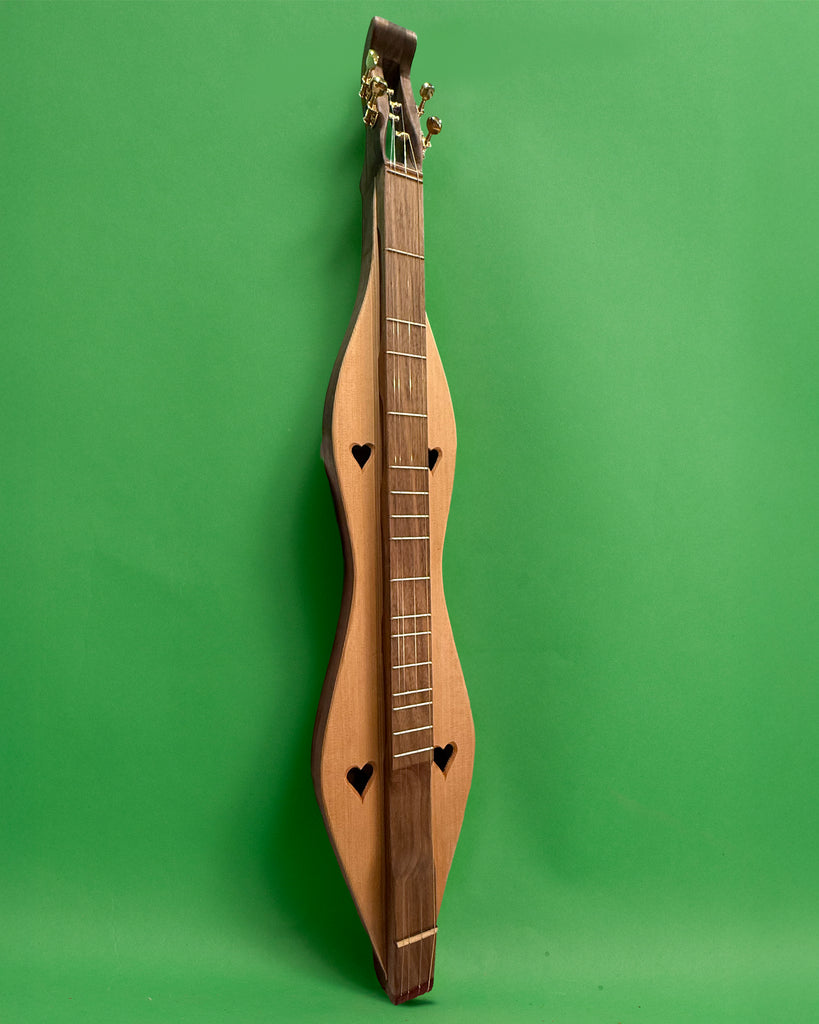 This is an hourglass shaped dulcimer contoured in the Huntington, WV tradition. Our most popular model and known for well balanced treble and bass tones, this 4-string June Apple model is crafted with a bookmatched fir top with hand carved traditional heart sound holes, bookmatched walnut steam bent and seasoned sides. A decorative wooden strip is inlayed on the center seam of a perfectly bookmatched walnut back. It has gold-plated Grover "Sta-Tite" metal tuners with brass gears and 14:1 gear ratio for microfine tuning.